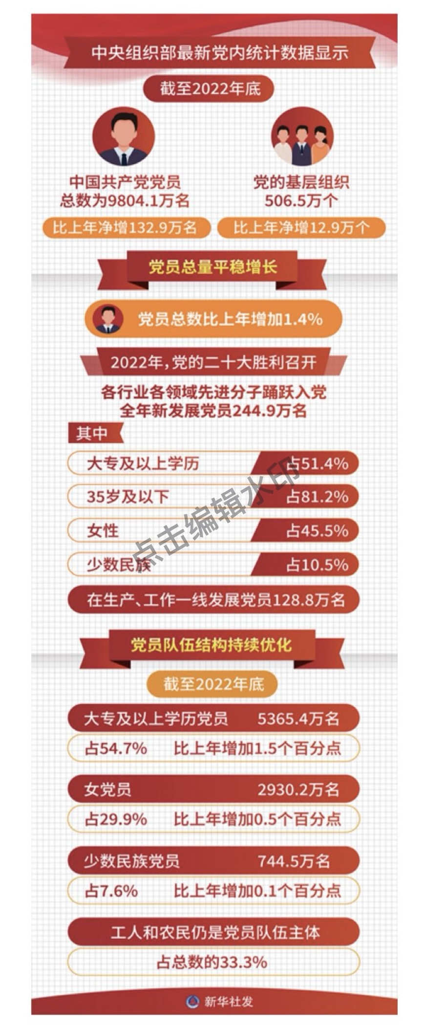 中央组织部2023年6月发布的《中国共产党党内统计公报》显示:截至2022年底,中国共产党党员总数为9804.1万名,比2021年底净增132.9万名。党的基层组织506.5万个,比2021年底净增12.9万个。历经百年风雨和新时代十年革命性锻造,中国共产党更加坚强有力、更加充满活力,党的组织体系日益严密,党的执政根基不断巩固。