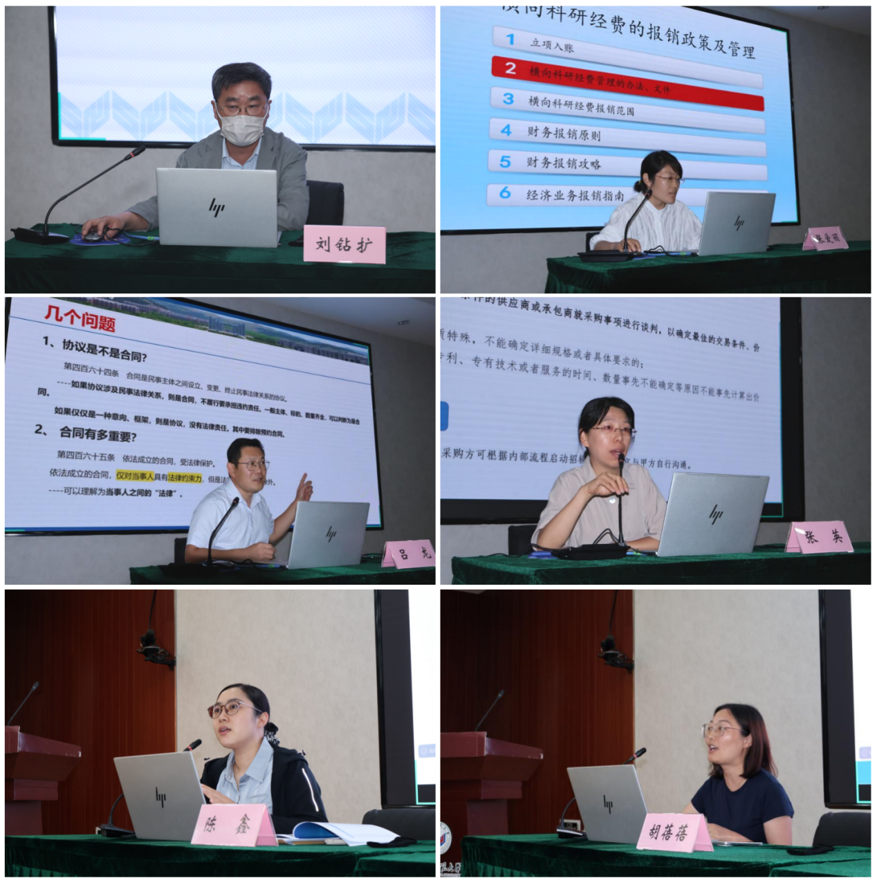 专项培训环节,财务处张爱丽解读《横向科研经费财务报销政策及管理》,明确经费使用范围、报销流程及管理要求,确保科研经费规范使用;校长办公室吕龙深入剖析《合同全周期法律风险识别与防范探究》,通过典型案例解析合同签订、履行中的法律风险点;地理与环境学院张英分享《招投标知识解析》,详细讲解招投标流程、法规要求及策略技巧;社会科学处陈鑫讲解《横向课题业务办理审核要点》,聚焦立项、过程管理、结项等关键环节的合规性审查;商学院胡蓓蓓作《横向课题免税申请及外协经验分享》,提供免税申请与外协的实战策略。