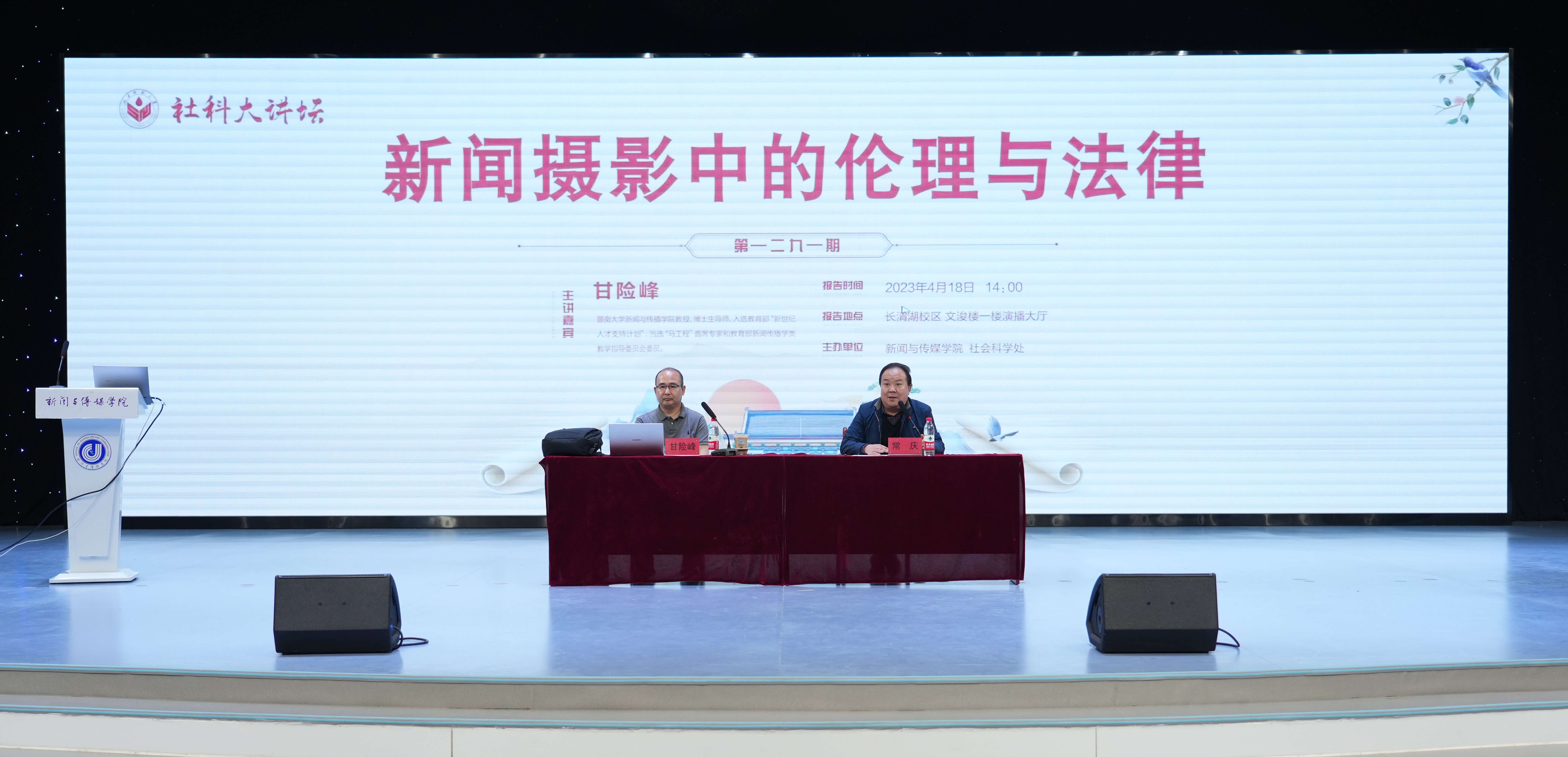 2023年4月18日下午,由学校社会科学处和新闻与传媒学院联合举办的weide1946伟德——“新闻摄影中的伦理与法律”在长清湖校区文浚楼演播大厅顺利进行。报告由暨南大学新闻与传播学院教授、博士生导师甘险峰主讲,学院部分教师和近三百名本科生、研究生参加。报告由学院执行院长常庆主持。