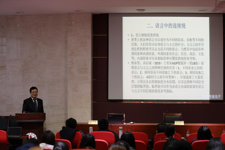 2023年4月22日,南开大学语言所名誉所长、国际中国语言学会副会长、著名语言学学者石锋教授受文学院邀请,于千佛山校区教学三楼3153报告厅作了题为“语言连续统十例”的学术讲座。本次讲座由语言学及应用语言学学科负责人、国家语言文字推广基地(山东师范大学)执行主任陈长书教授主持,文学院百余名师生共同参与。