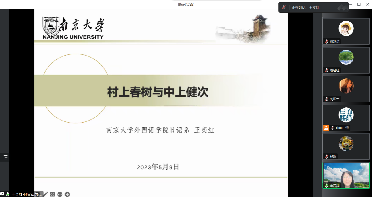 2023年5月9日晚,应外国语学院邀请,南京大学外国语学院日语系教授,博士生导师王奕红教授依托腾讯会议开展题为“村上春树与中上健次”的线上学术讲座。此次讲座由山东师范大学外国语学院日语系副主任崔颖副教授主持,日语系部分教师和本科生、研究生约120余人在线上聆听了讲座并参与交流。