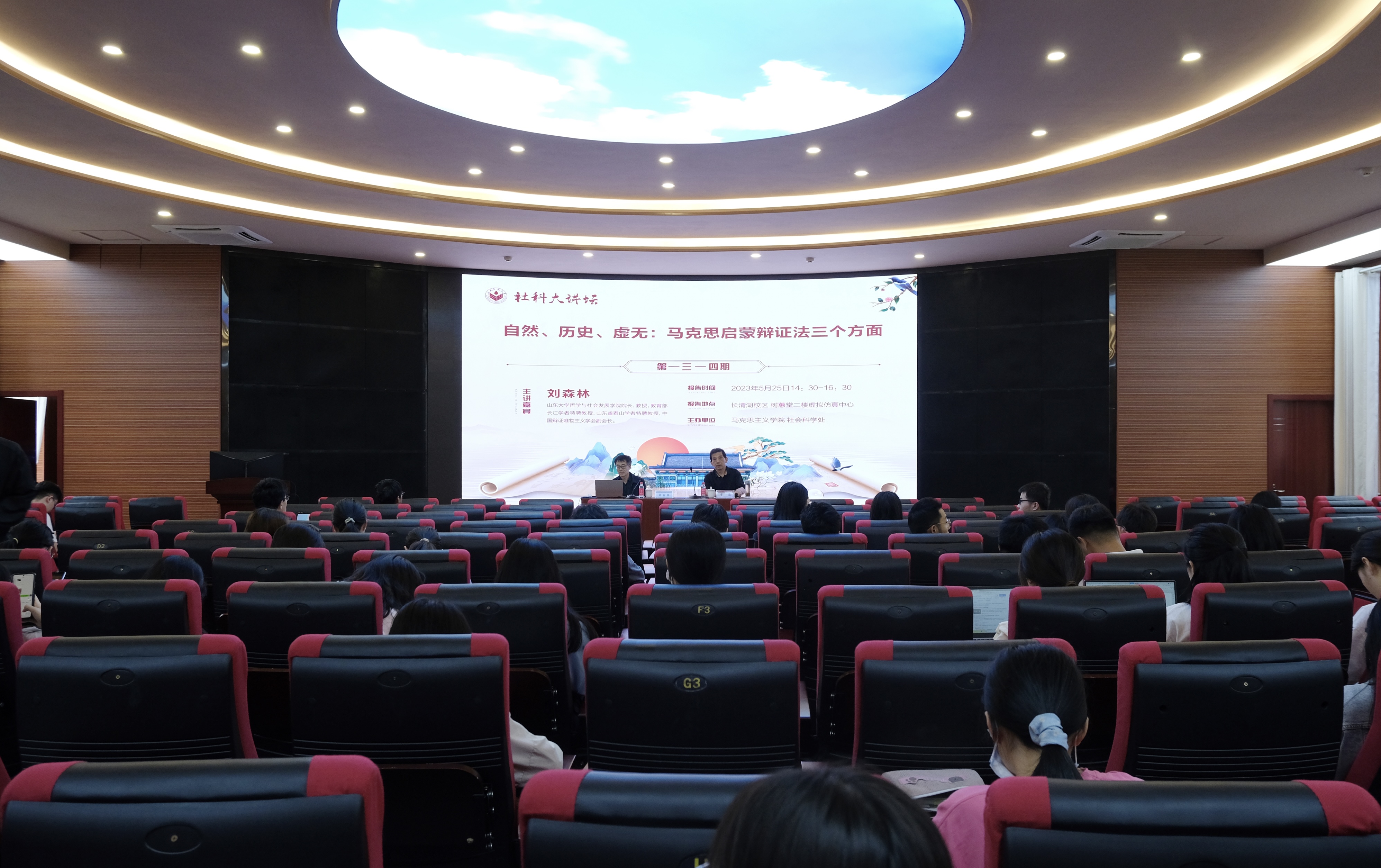 2023年5月25日下午,由马克思主义学院与社会科学处联合举办的第1314期weide1946伟德于长清湖校区树蕙堂二楼虚拟仿真中心开讲。本次大讲坛特邀山东大学哲学系教授、哲学与社会发展学院院长,教育部长江学者特聘教授刘森林担任报告会主讲人,作题为“自然、历史、虚无:马克思启蒙辩证法的三个方面”的学术讲座。本次报告会由山东师范大学马克思主义学院李荣教授主持,百余名学院师生参加此次讲坛。