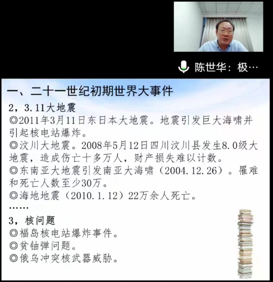 首先,陈世华教授从十二个主题介绍了二十一世纪初期的世界大事件,这些主题分别为3.11大地震、9.11事件、核问题、疾病(传染病)、“人类世”生态担忧、金融与财税危机、老龄化问题、地区局部冲突、日本右翼分子发起“钓鱼岛事件”、宗教问题、太空探索、肉眼看不见的“大事件”等。陈教授指出,文学与事件密切相关,从这些事件中可得到研究线索,并分别阐述了每个事件后可研究的课题。