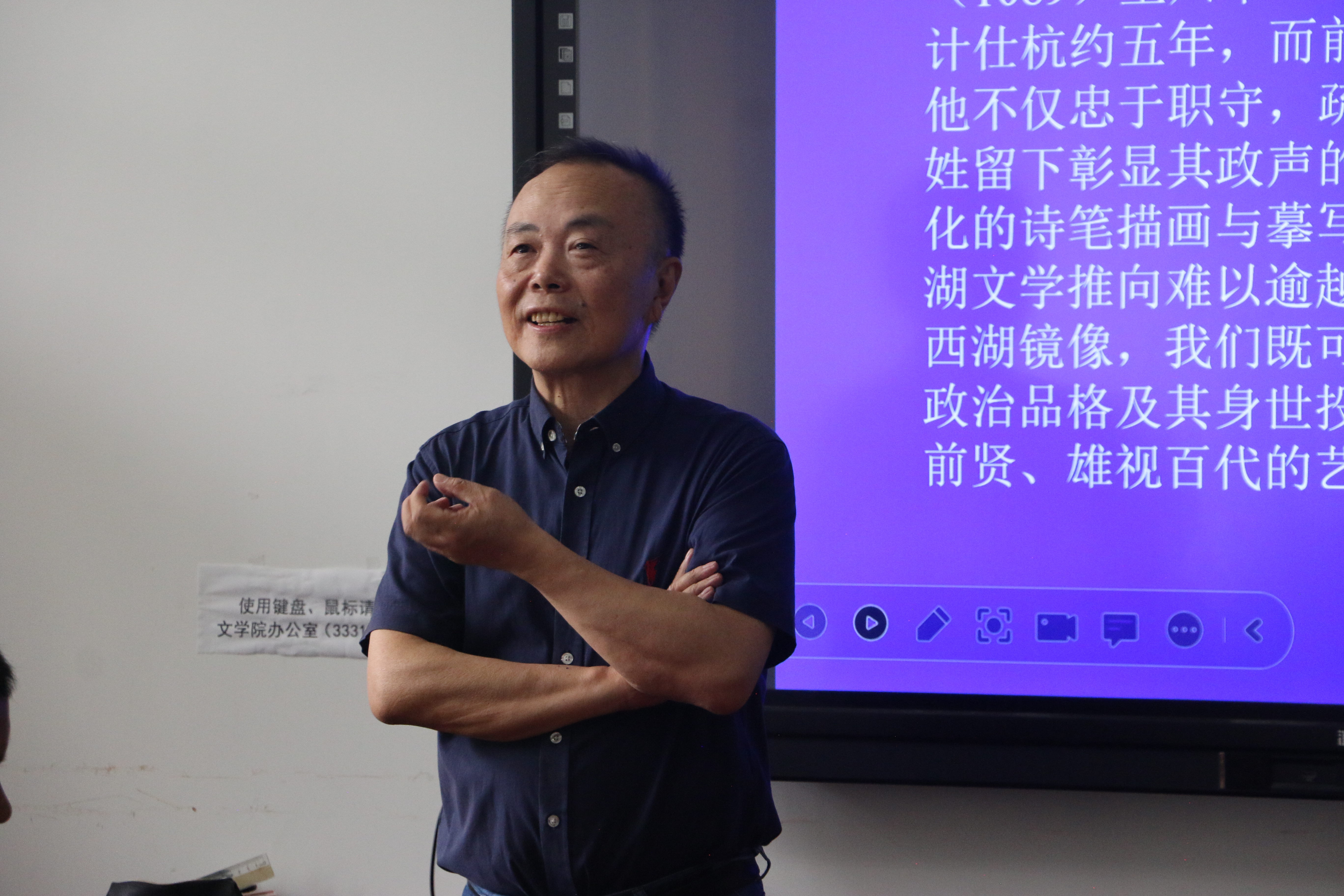 2023年6月16日下午,浙江工业大学人文学院教授、浙江大学博士生导师,国家万人计划教学名师,浙江省特级专家肖瑞峰教授应邀来到文学院,于教学三楼3141会议室作题为“苏轼诗中的西湖镜像”的学术讲座,本次讲座由山东师范大学文学院中国古代文学专业博士生导师薛泉教授主持,山东师范大学文学院李伟、王培峰、刘靖渊、魏青、刘英波等教师出席,中国古代文学等专业博士、硕士研究生到场聆听。