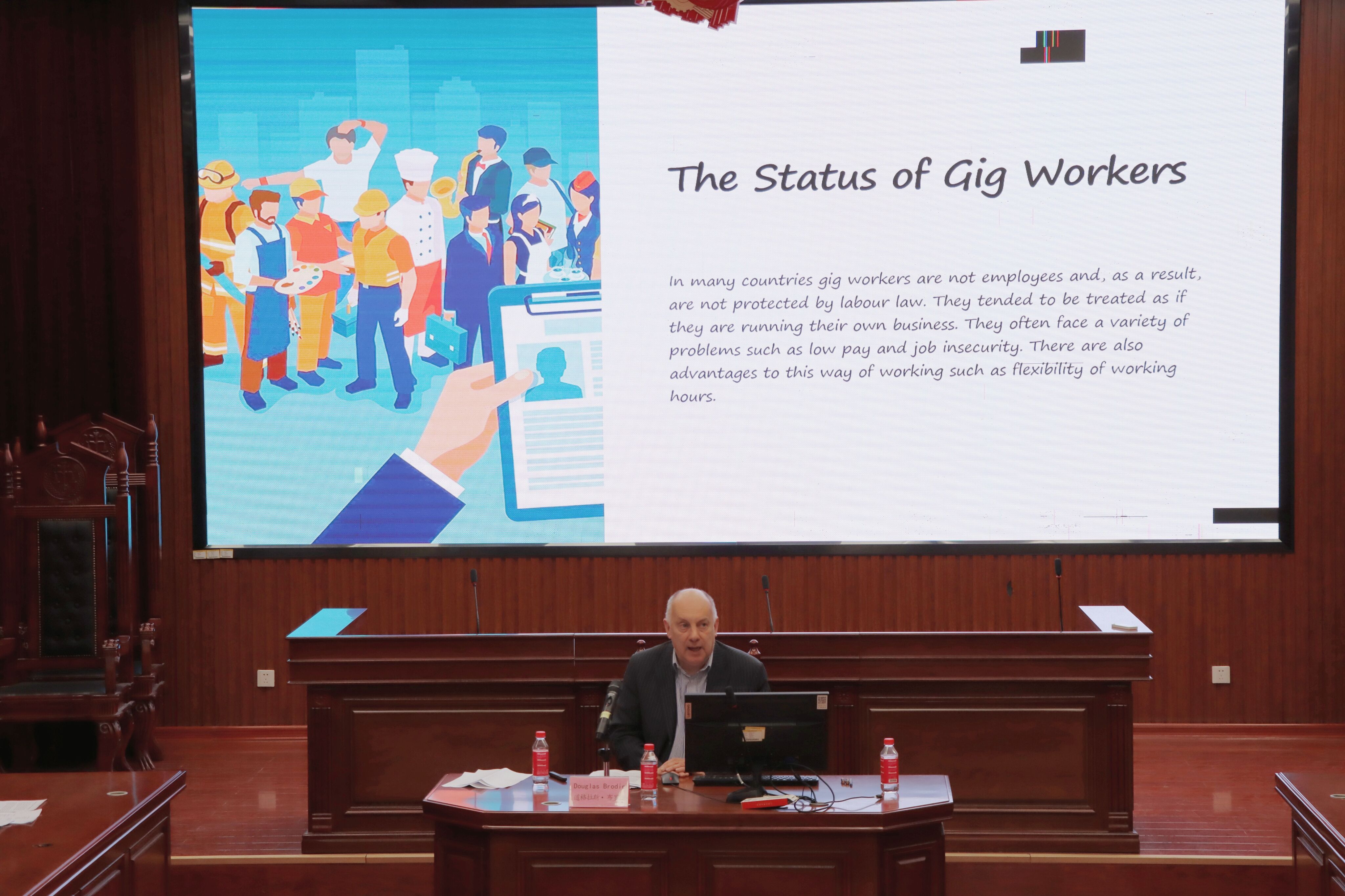 随后,他以工人用数字平台谋生的全球性为背景,简要介绍了数字平台工作的分类,即主要分为在线完成并交付的工作和现实世界的传统工作两类。通过引用国内外工人的案例,他讲解了这类工作稳定性和劳动回报率低,并且风险会随着劳动时间的延长而增大等特点,使同学们对数字平台的利弊有了初步了解。同时,道格拉斯•布罗迪教授从工人选择数字平台工作的原因入手,讲述了数字平台工作在时间和地点上的灵活性,便于工人在兼顾生活与工作的情况下增加收入来源。以此为基础,他进一步引出在许多国家,平台工人不是雇员,因此不受劳动法保护,遇到纠纷时劳动者往往处于弱势地位这一现象。接着,他通过分析工人与平台之间的法律关系,介绍了不同国家对工人权利保护的措施,详细分析了英国、新西兰以及澳大利亚针对数字平台工作的工人所采取的不同保护方法,并针对不同国家的情况讲述了现有方法的弊端。会议最后,道格拉斯•布罗迪教授强调,在对工人进行有效保护时,要健全劳动者权益相关法律法规,强化数字平台的运营管理,同学们进行相关学习研究要持续关注其发展动态,以期全面保护劳动者的收入和人身安全。整个活动过程中,学院师生积极提问,道格拉斯•布罗迪教授针对问题进行了详细且深入的解答,其循序渐进的引导方式使在座师生受益匪浅。