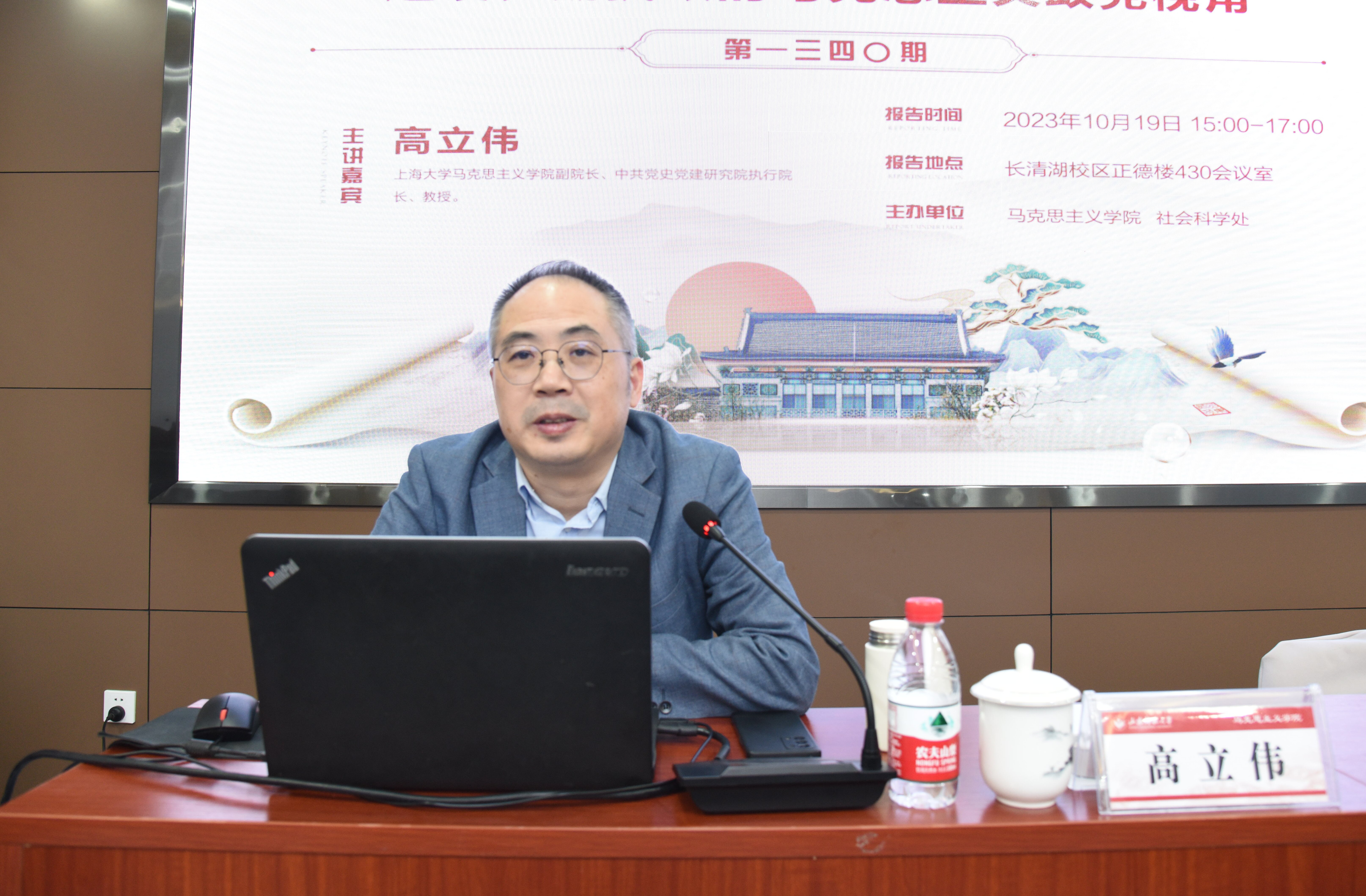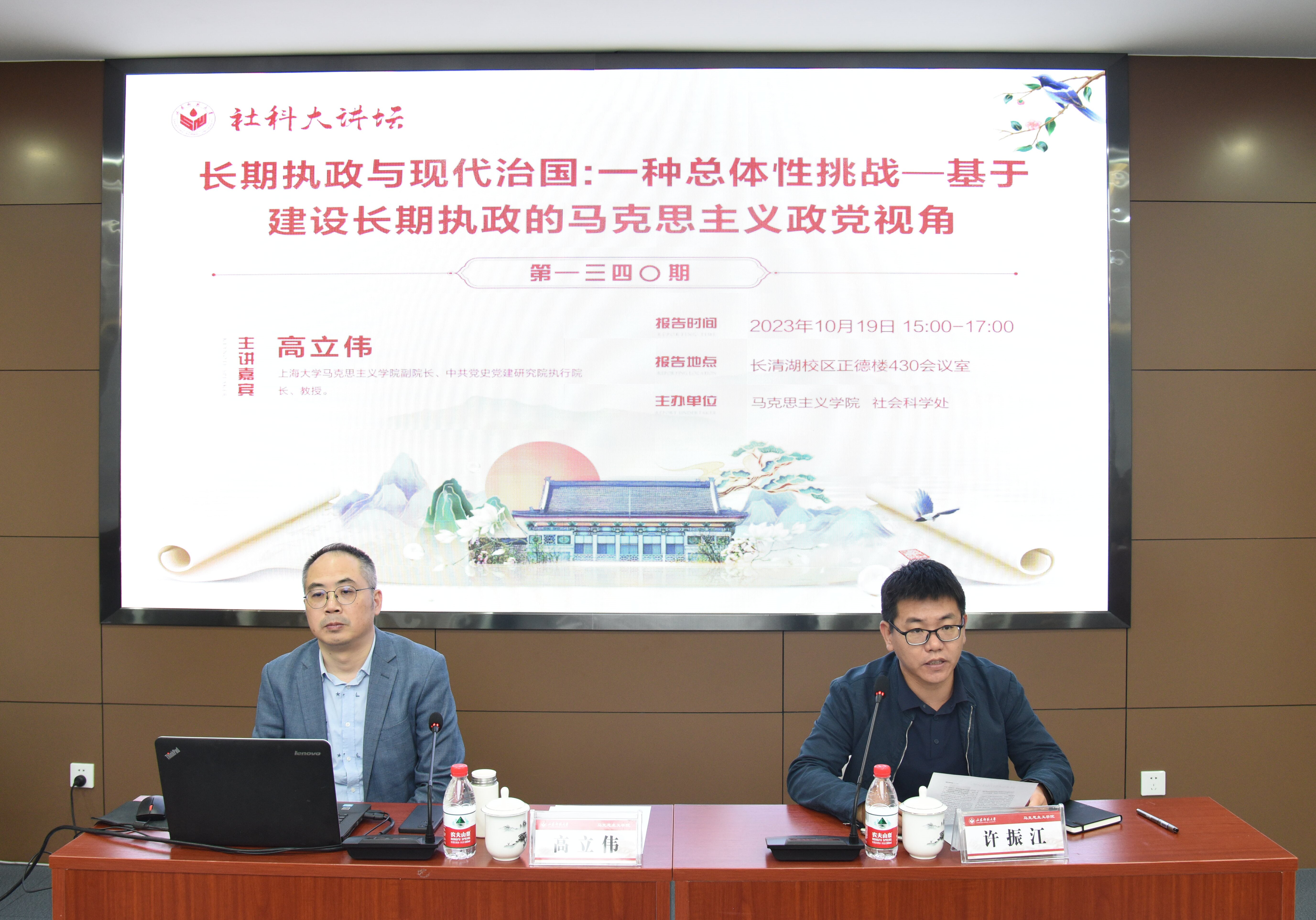 10月19日下午,由马克思主义学院与社会科学处联合举办的第1340期weide1946伟德于长清湖校区正德楼430会议室开讲。本次大讲坛特邀上海大学马克思主义学院副院长、中共党史党建研究院执行院长、教授高立伟担任报告会主讲人,作了题为“长期执政与现代治国:一种总体性挑战——基于建设长期执政的马克思主义政党视角”的学术报告。本次报告会由山东师范大学马克思主义学院中共党史系副主任许振江主持,百余名学院师生参加此次讲坛。