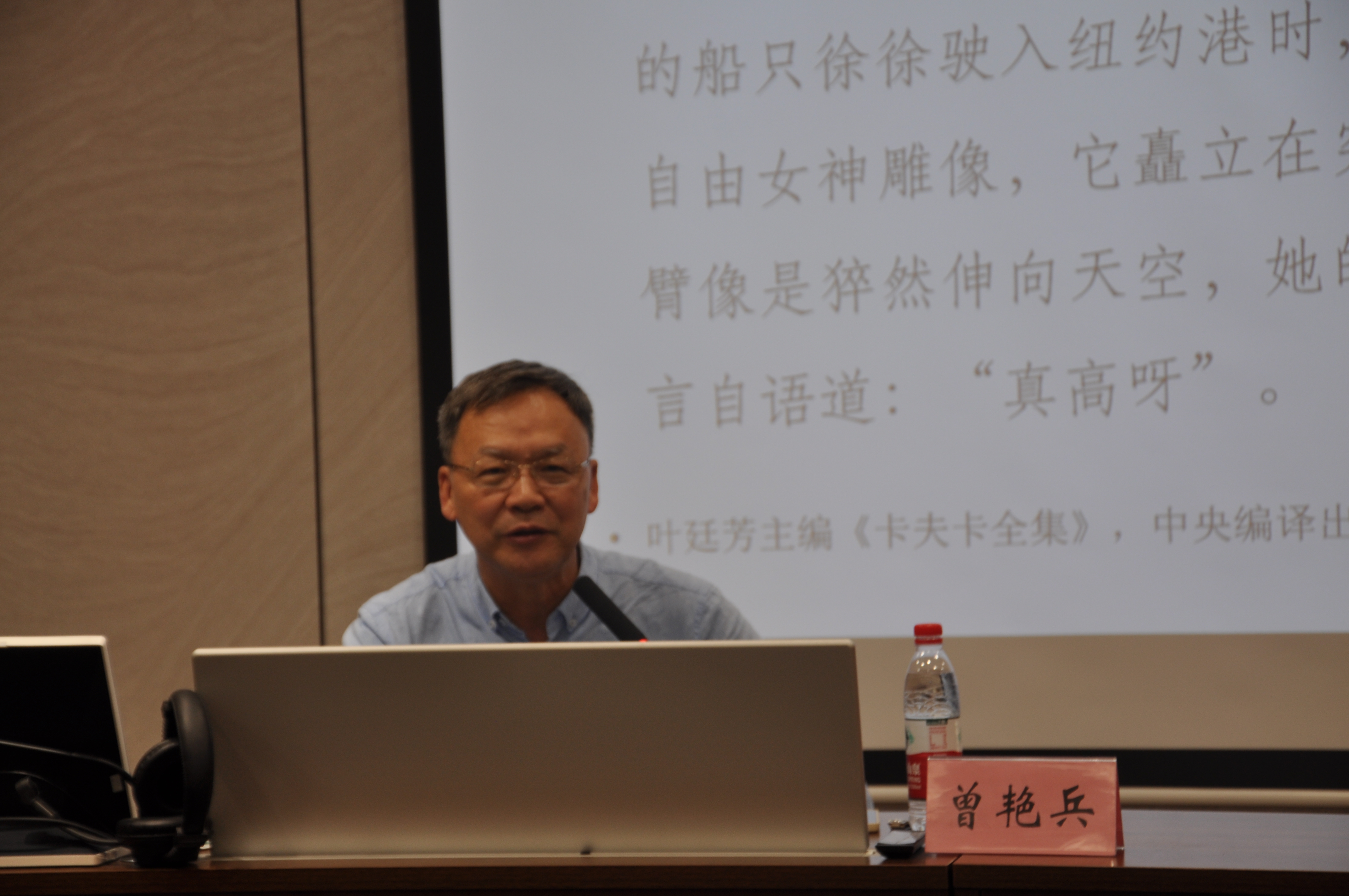 曾艳兵教授首先解释了自己研究的缘由:他在初次阅读《美国》时便存在疑惑,自由女神像手持利剑,为何卡夫卡要把“火炬”写成“利剑”?在英语中,“火炬”和“利剑”这两个词在发音和拼写上都有很大区别,这说明这是卡夫卡有意而为。他认为,“剑”是小说的核心,研究这把“剑”具有一定的现代意义,能够预演美国后面百年的发展路径和可能性。