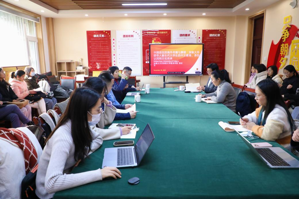 2023年12月28日下午,加拿大卡尔加里大学终身教授、英国诺丁汉大学荣誉教授郭世宝受邀做客文学院崇文大讲堂,为我院师生作了题为“中国语言的海外传播:加拿大华侨华人新生代大学生的中文教育、身份认同和文化传承”的学术讲座。本次讲座由文学院国际中文教育专业学位点负责人王红娟老师主持,山东师范大学教授、加拿大埃德蒙顿孔子学院中方院长刘蓓评点。文学院副院长邹强、加拿大卡尔加里大学英语语言教育教授郭燕和文学院研究生参加讲座。