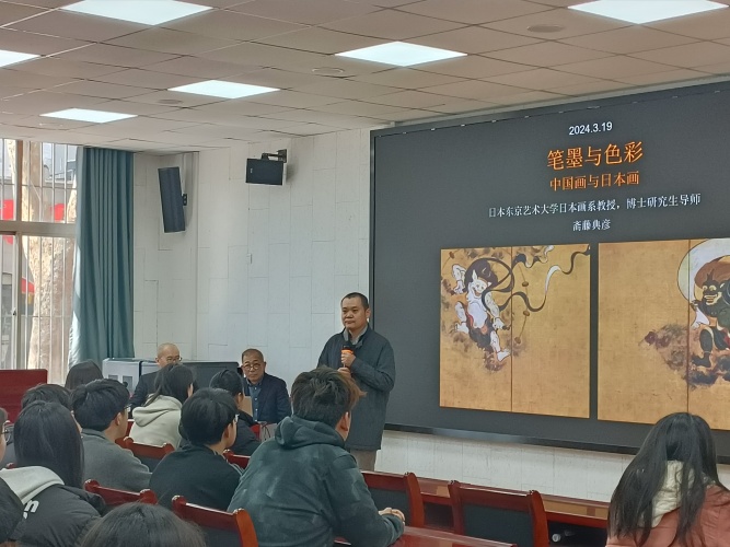 日本东京艺术大学,日本画研究室教授,博士研究生导师斋藤典彦教授,于2024年3月19日在山东师范大学千佛山校区教学2楼进行学术讲座,讲座由美术学院院长刘明波主持。