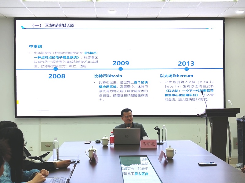 之后,马明亮教授就虚拟货币需要通过区块链技术实现去中心化交易的特点引出区块链技术,说明了区块链技术为虚拟货币的创建、交易和管理提供了基础设施的基本原理,并解释二者是相互依存、相互促进的关系。接下来,马明亮教授借助区块链去中心化、匿名性、交易便捷、不可篡改、非对称加密的核心特性引导同学们进一步了解它的技术性优势。同时,马明亮教授指出犯罪分子经常以虚拟货币为对象、工具或者噱头来进行诈骗、敲诈勒索等犯罪行为,“币圈”与“链圈”巨大的价值波动等隐患威胁下,国家禁止虚拟货币的金融活动。因此,各部门对于虚拟货币的监管政策进行了三大调整,分别为虚拟货币不可作为货币在市场上流通使用、不得买卖虚拟货币及虚拟货币相关业务活动皆为非法金融活动。