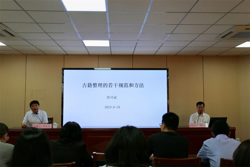 古籍整理是文献学的重要内容,也是学术研究的入门功夫。本次讲座,廖可斌教授从古籍整理类书籍中容易出现的问题谈起,结合具体实例,为大家讲述了古籍整理中需要注意的一些规范与方法。第一,定位准确,是古籍整理的前提。在整理古籍时,首先要结合文献的重要性、完整性、独立性考虑这个选题是否有价值;其次要结合古籍的属性、受众群体、功能等考虑该如何整理,不同类型的文献应采取不同的整理形式。第二,全面掌握书目和版本源流,合理选择底本和校本,是古籍整理的关键。在整理古籍时,必须全面调查掌握书目及每种书目的所有版本,了解不同版本的异同优劣,理清版本之间的源流关系,最好能绘制出“版本源流图”,在此基础上,根据从早、从全、从善的原则,综合考虑,合理选择底本和校本。第三,要熟悉一些重要的目录学著作、丛书及电子资源库,如《汉书·艺文志》《隋书·经籍志》《四库全书总目》《中国丛书综录》《中国古籍总目》“四库”系列丛书、“丛书集成”系列、全国古籍普查登记基本数据库等等。然后,廖可斌教授依次为大家介绍了古籍整理中编排体例、标点、校勘、注释、辑佚、附录、前言、凡例等方面需要注意的问题,指出古籍整理的目标应该是“全、准、清、精”。