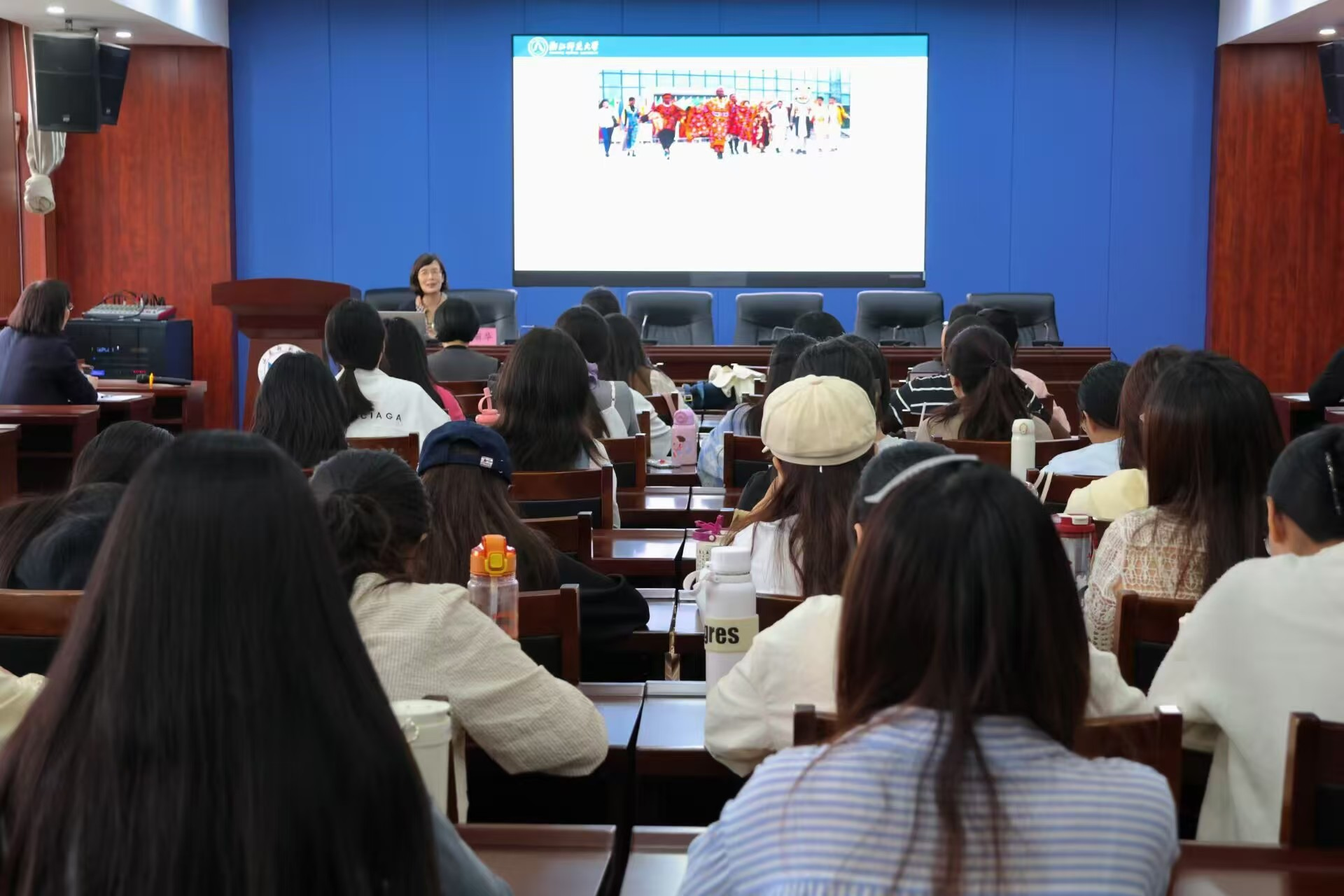 徐丽华教授与在场师生围绕讲座主题展开了深入的讨论。她不仅就国际中文教育的实习和就业前景进行了详尽的分享,还就学术研究领域与学生们进行了亲切且富有启发性的交流。徐教授鼓励学生们积极拓宽视野,走出国门,以本土文化为根基,进一步在国际舞台上进行学习和交流。