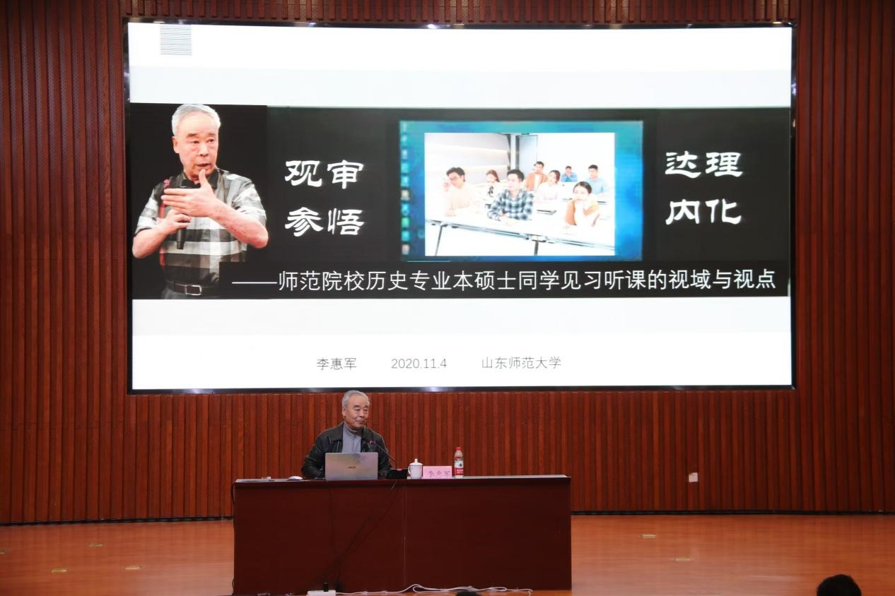 寒霜染秋露,金风送桂香。在这美丽的深秋时节,山东师范大学“社科大讲堂”邀请到了教育部历史课程国培计划专家、中国教育学会历史教师教育专业委员会副理事长、全国著名历史特级教师李惠军为历史文化学院师生开设了一堂题为“观审·参悟·达理·内化”的讲座,旨在帮助师范院校历史专业的本科生和硕士生把握见习听课的视点和视域。讲座于11月4日下午在山东师大文昌楼105报告厅举行,山东师大历史文化学院教师教育中心主任兼教师教学发展中心主任、博士生导师楼建军教授,学院教师教学发展中心副主任、硕士生导师李晓华副教授,学院兼职硕士研究生导师、山东师大在读教育博士赵然,学院2022级本科生辅导员孟晓雨出席此次讲座。讲座由楼建军教授主持。