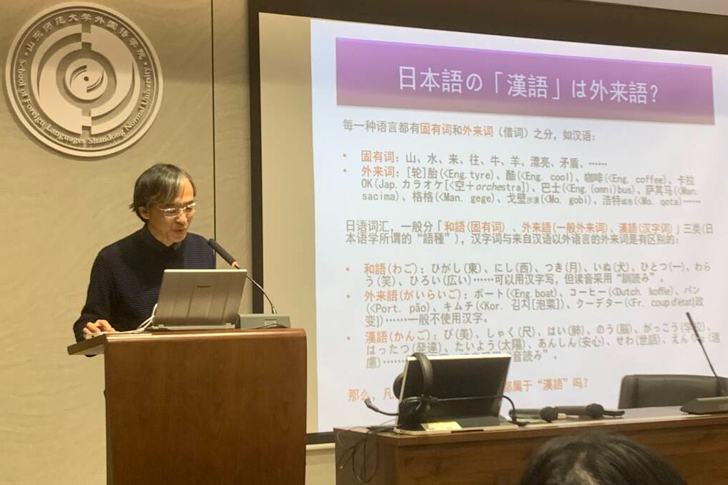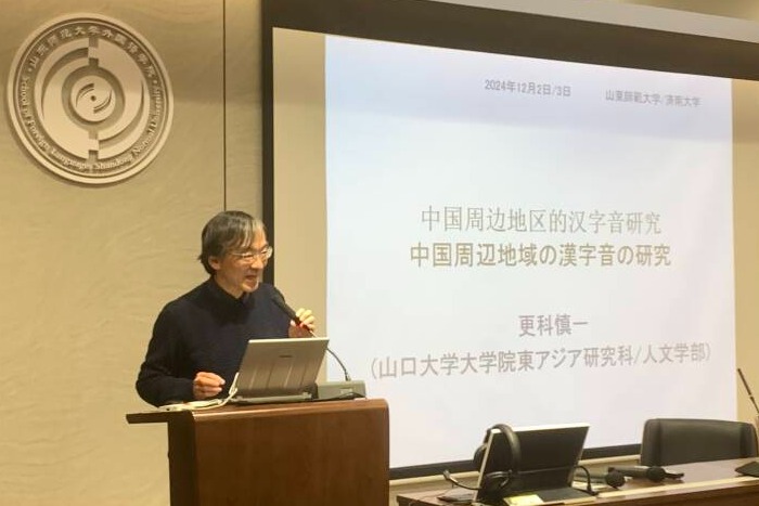 讲座的第一部分由更科慎一教授主讲,主题为《中国周边地区的汉字音研究》。他以一个启发性的提问“日语中的‘汉语词’是外来语吗?”开篇,从日语中的汉字词汇切入,逐步揭示日本汉字音的起源与发展历程。他讲述了汉字随文化交流传入日本的历史脉络,并通过丰富的学术资料说明了现行日本汉字音为何存在多种读音的原因。