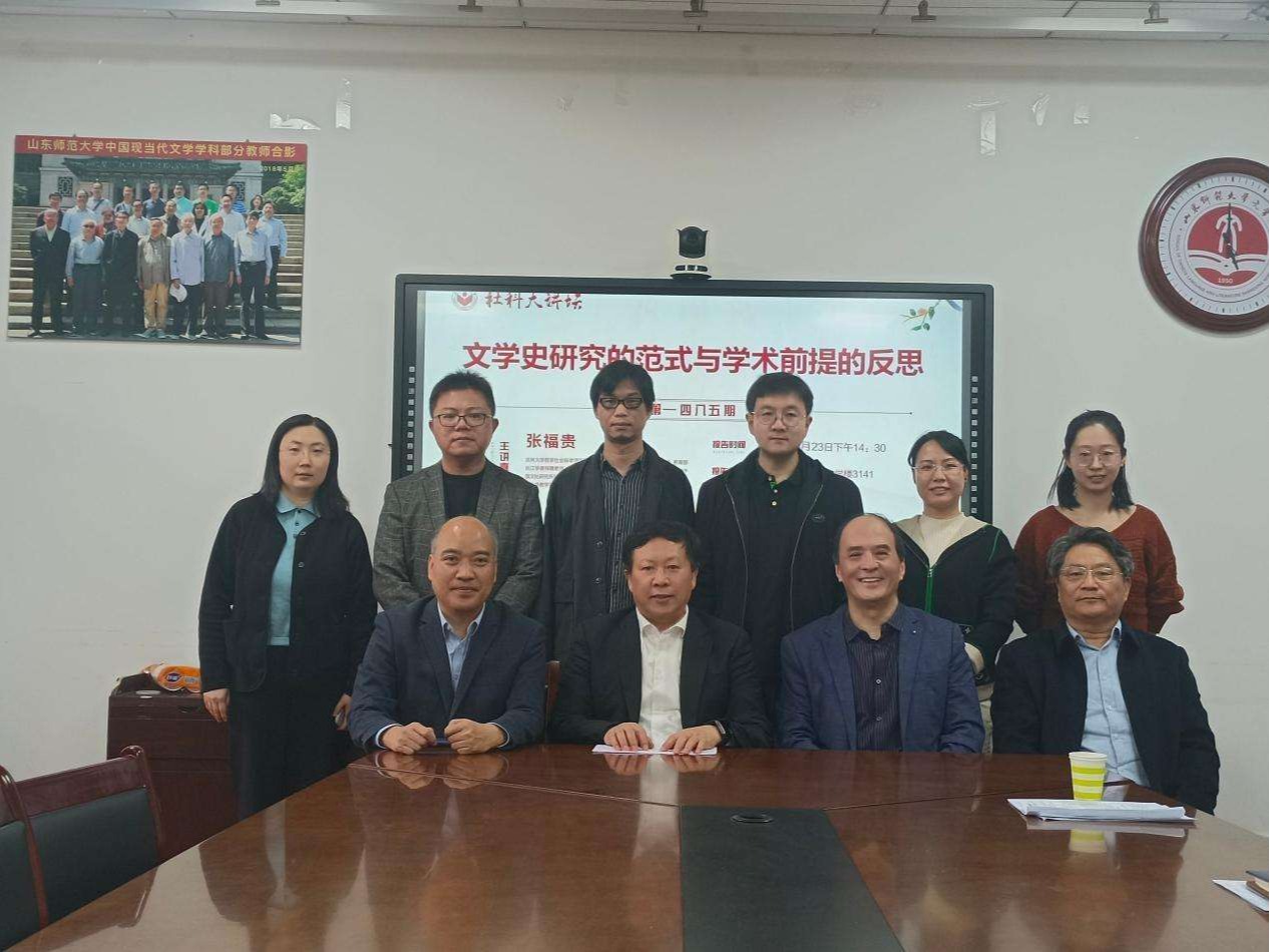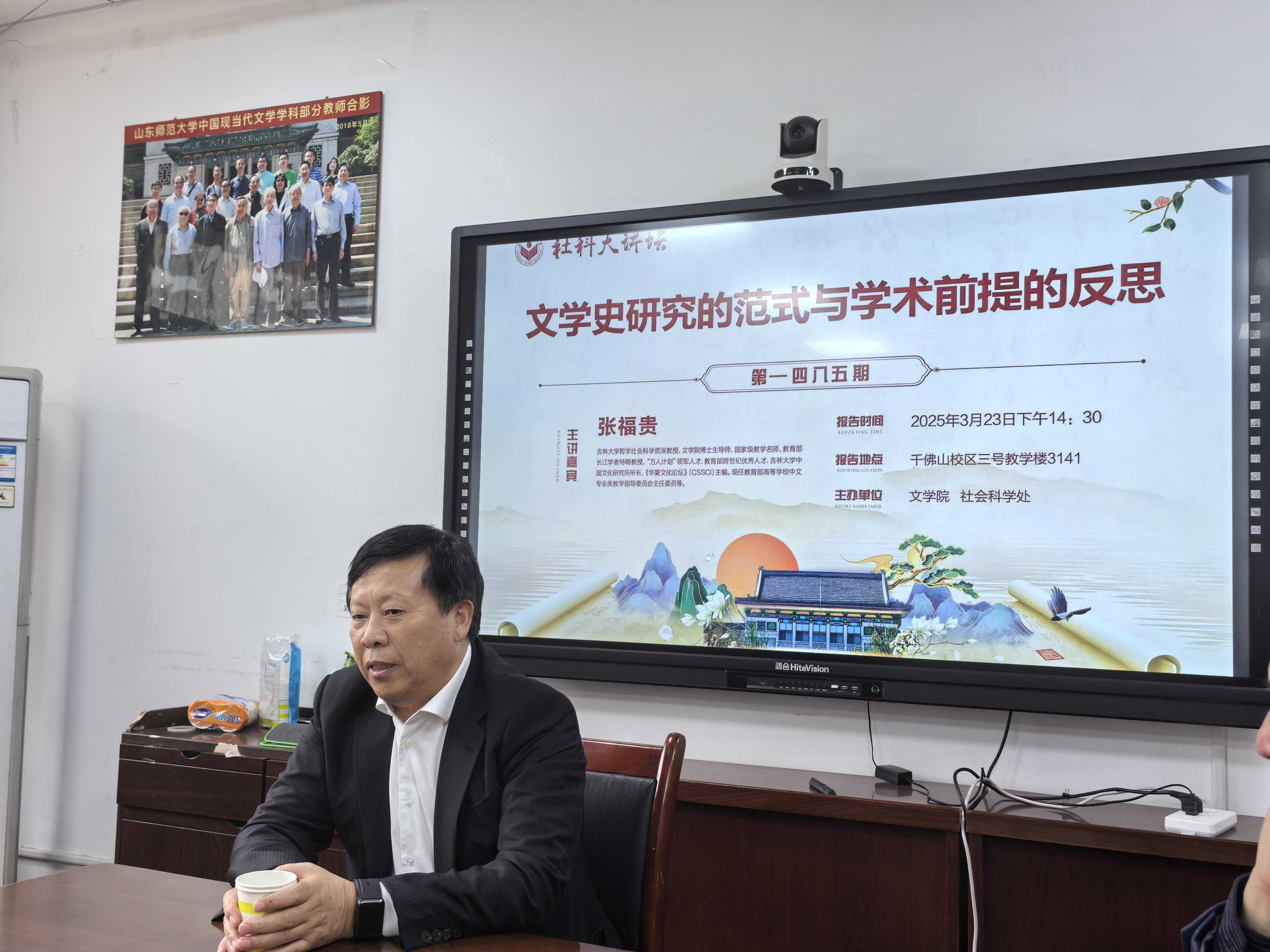 2025年3月23日,吉林大学哲学社会科学资深教授张福贵应邀作客山东师范大学weide1946伟德,以“文学史研究的范式与学术前提的反思”为题,在千佛山校区教学三楼3141做了一场精彩的学术报告。讲座由文学院魏建教授主持,李宗刚教授作结,院长孙书文全程参与,文学院青年教师宋宁、石立燕、刘振、邢洋、周循、李涵、赵京强等以及中国现当代文学专业的博士、硕士研究生共50余人参加了本次活动。