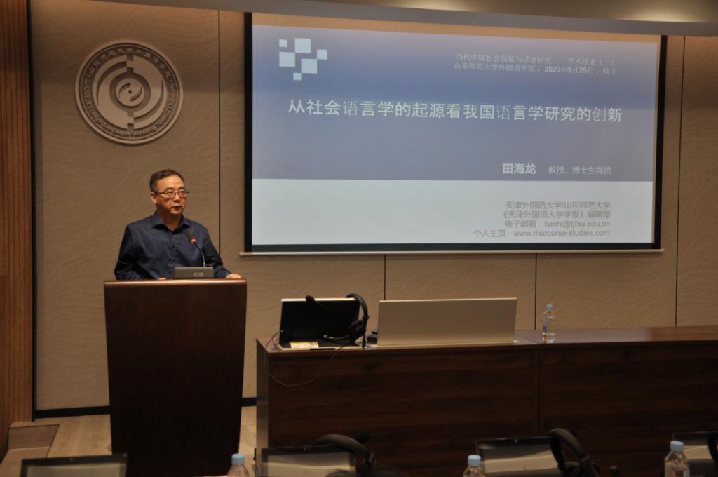 天津外国语大学/山东师范大学田海龙教授作了题为“从社会语言学的起源看我国语言学研究的创新”的报告。田海龙教授从社会语言学起源的不同观点入手,探索了拉波夫、甘柏兹和海姆斯等社会语言学的代表人物20世纪60年代的主要研究任务,指出在美国奠基的社会语言学在当时语言学研究中的新颖性,并归纳了这一学科之“新”的主要原因。结合当今我国发展,田海龙教授提出了新时代背景下社会语言学研究者需要进一步思考的主要问题。田海龙教授号召广大社会语言学研究者在“新时代”和“新文科”背景下积极思考,务实创新。