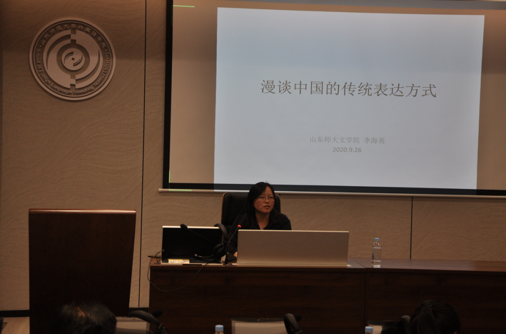 山东师范大学李海英教授做了题为“漫谈中国的传统表达方式”的报告。李海英教授从英汉回文例子入手,介绍了汉语的传统表达方式,即包含辞格和辞趣两部分内容。回文格渊源已久,李海英教授以具体的例子强调有意义的形式的重要性,还介绍了飞白格、别解格、仿词格、仿调格、镶嵌格、藏词格等辞格,分别以例子展现每一种辞格的美。此外,李海英教授强调精通外语的同时也需要关注且保持中国传统文化自带的精神和素养。