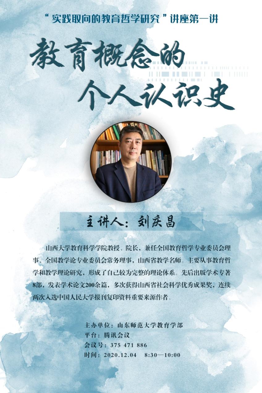 12月4日上午,应教育学部实践取向的教育哲学创新团队邀请,山西大学教育科学学院院长、全国教育哲学专业委员会理事、全国教学论专业委员会常务理事、山西省学前教育研究会副理事长刘庆昌教授通过腾讯会议做了题为“教育概念的个人认识史”的学术讲座。讲座由教育学部孙瑞玉主持,学部部分教师、研究生及本科生参加了本次讲座。